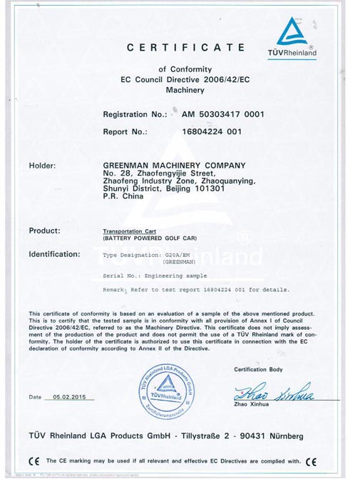近日,由綠友集團自主研發的GREENMAN兩座電瓶車golf car通過了CE認證。