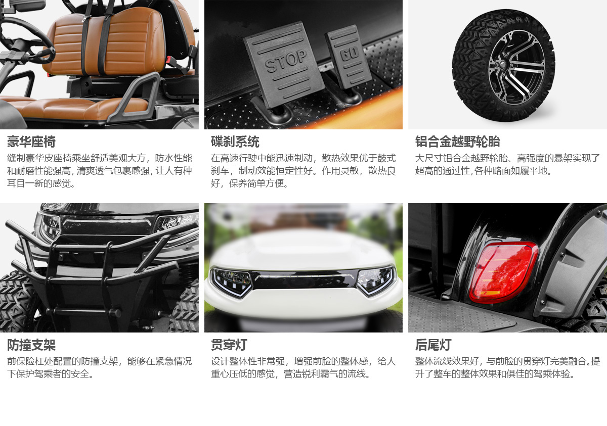 四輪液壓碟剎+電子駐車。車輛底盤高、動力足、安全性高,具備非同一般的駕乘感。